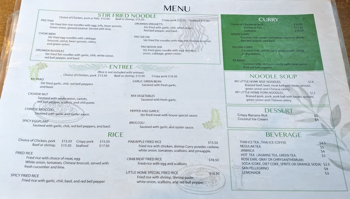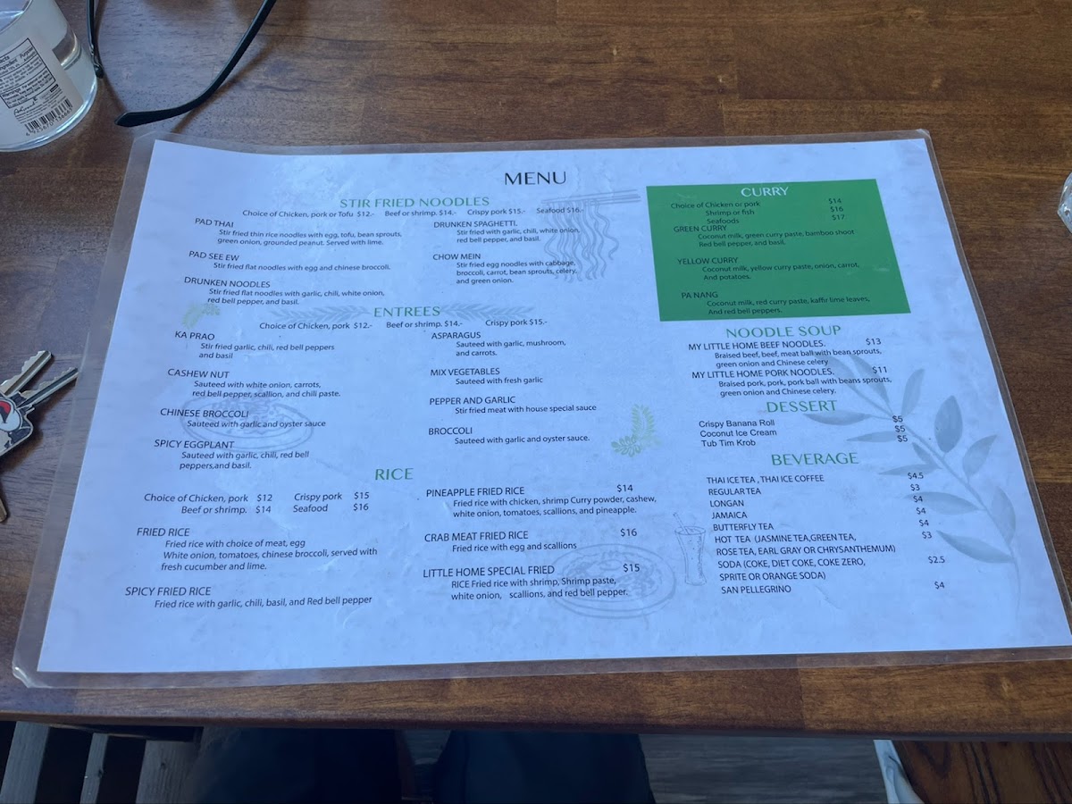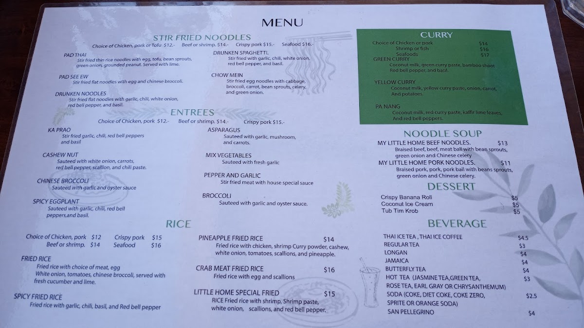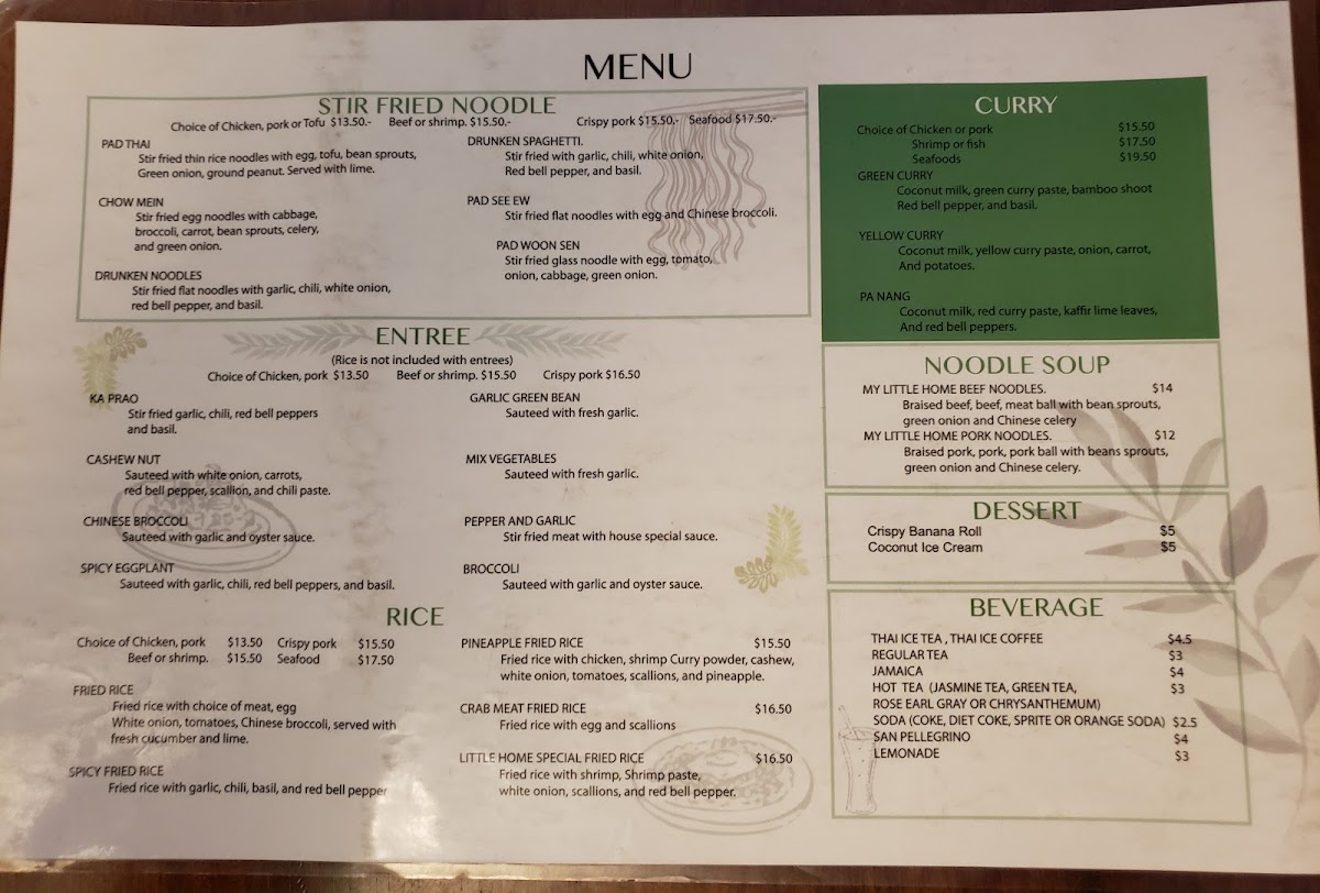The menu at My Little Home Thai Kitchen offers a delightful range of authentic Thai dishes, showcasing rich flavors and fresh ingredients. For noodle soup lovers, the My Little Home Pork Noodles and My Little Home Beef Noodles are perfect choices, while the curry section features the bold Yellow Curry, Green Curry, and Pa Nang. Entree options like Garlic Green Bean, Spicy Eggplant, and Pepper and Garlic Mixed Vegetables bring vibrant flavors to the table. The salad selection includes refreshing options like Seafood Salad, Thai Salad, and the tangy Som Tum (Papaya Salad), with variations such as Som Tum Crispy Pork for those seeking extra richness. Appetizers such as Larb Tod, Pork Jerky, and Crispy Egg Rolls set the stage for a flavorful meal. For those looking for comfort, the Tom Kha and Tom Yum soups stand out, while the unique Khao Soi (Chiang Mai Curry Noodle) is a must-try special. Stir-fried noodle options include the iconic Pad Thai, Pad Woon Sen, and Drunken Spaghetti. Rice dishes like Crab Meat Fried Rice and Pineapple Fried Rice offer a perfect balance of savory and sweet. For lunch, the Pepper Garlic Rice Bowl and Fried Rice Bowl provide hearty options. Don't forget to indulge in dessert with treats like Mango Sticky Rice and Crispy Banana Roll. To complement the meal, there are beverages such as Thai Iced Tea, Jamaica, and Lemonade. With its diverse and flavorful menu, My Little Home Thai Kitchen is a fantastic choice for anyone craving authentic Thai cuisine.