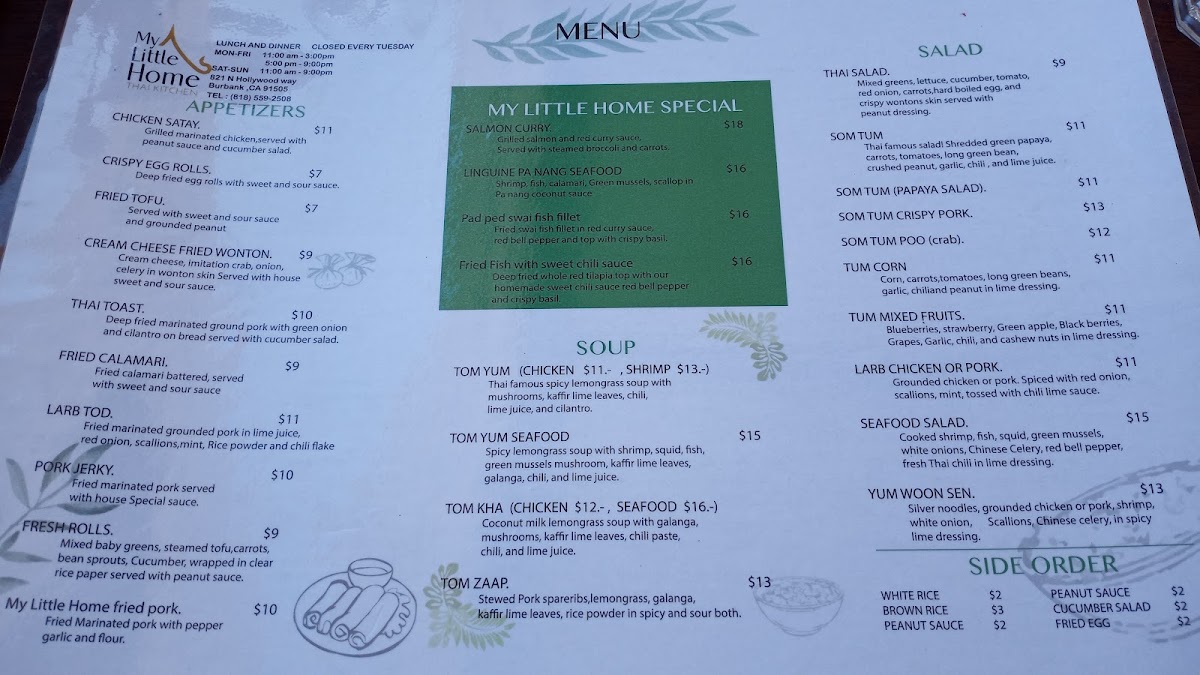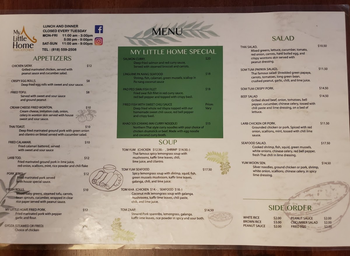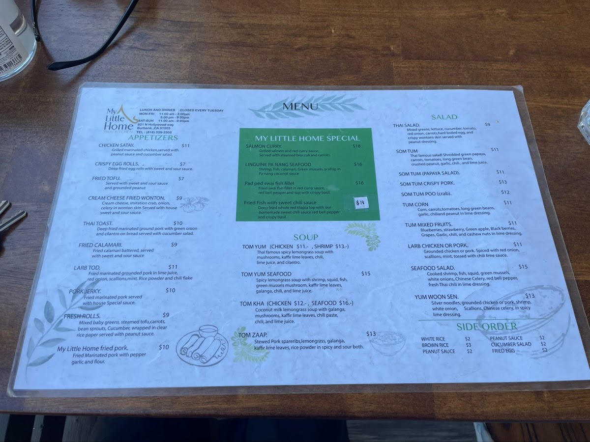 The menu at My Little Home Thai Kitchen offers a delightful range of authentic Thai dishes, showcasing rich flavors and fresh ingredients. For noodle soup lovers, the My Little Home Pork Noodles and My Little Home Beef Noodles are perfect choices, while the curry section features the bold Yellow Curry, Green Curry, and Pa Nang. Entree options like Garlic Green Bean, Spicy Eggplant, and Pepper and Garlic Mixed Vegetables bring vibrant flavors to the table. The salad selection includes refreshing options like Seafood Salad, Thai Salad, and the tangy Som Tum (Papaya Salad), with variations such as Som Tum Crispy Pork for those seeking extra richness. Appetizers such as Larb Tod, Pork Jerky, and Crispy Egg Rolls set the stage for a flavorful meal. For those looking for comfort, the Tom Kha and Tom Yum soups stand out, while the unique Khao Soi (Chiang Mai Curry Noodle) is a must-try special. Stir-fried noodle options include the iconic Pad Thai, Pad Woon Sen, and Drunken Spaghetti. Rice dishes like Crab Meat Fried Rice and Pineapple Fried Rice offer a perfect balance of savory and sweet. For lunch, the Pepper Garlic Rice Bowl and Fried Rice Bowl provide hearty options. Don't forget to indulge in dessert with treats like Mango Sticky Rice and Crispy Banana Roll. To complement the meal, there are beverages such as Thai Iced Tea, Jamaica, and Lemonade. With its diverse and flavorful menu, My Little Home Thai Kitchen is a fantastic choice for anyone craving authentic Thai cuisine.